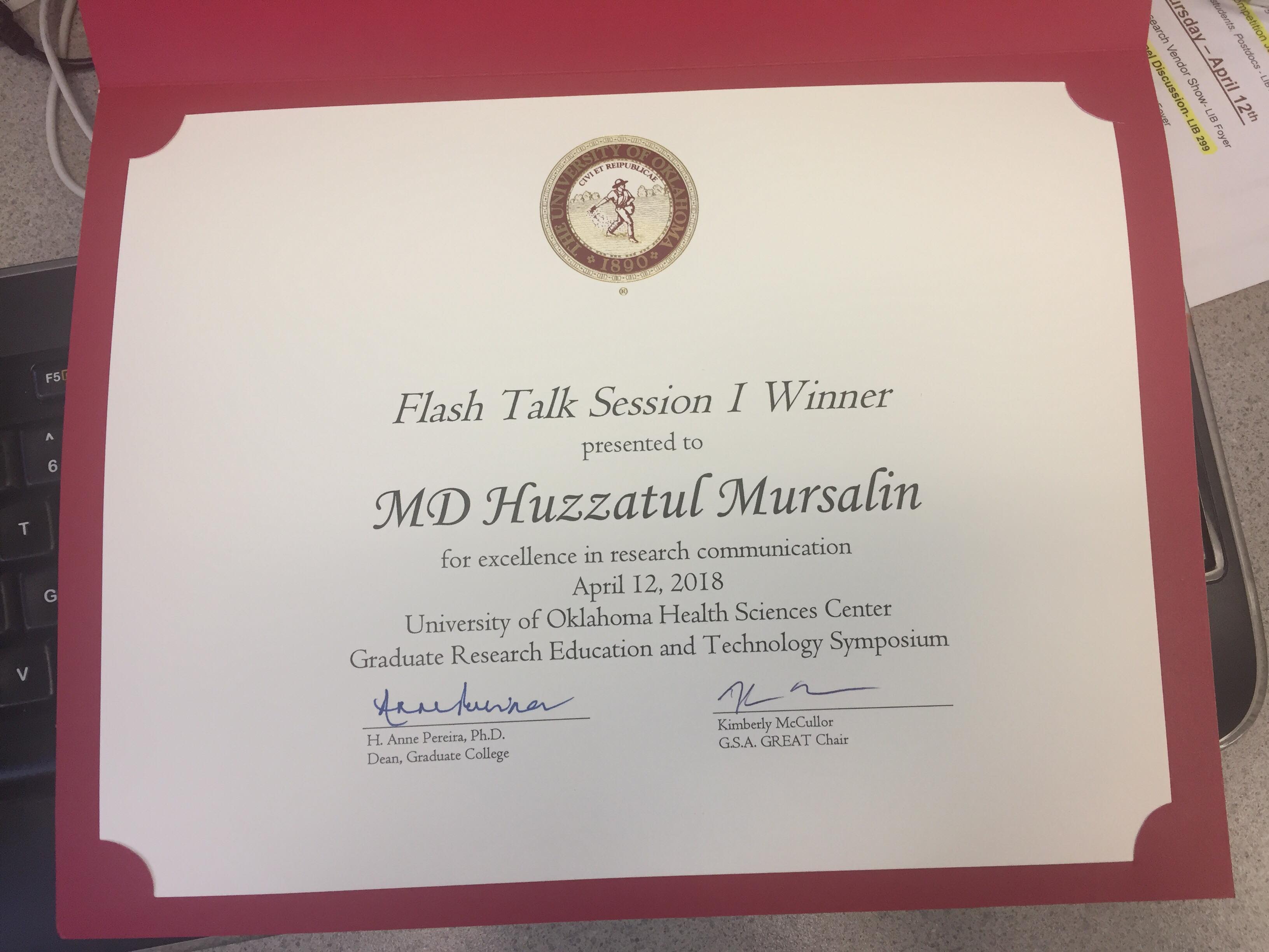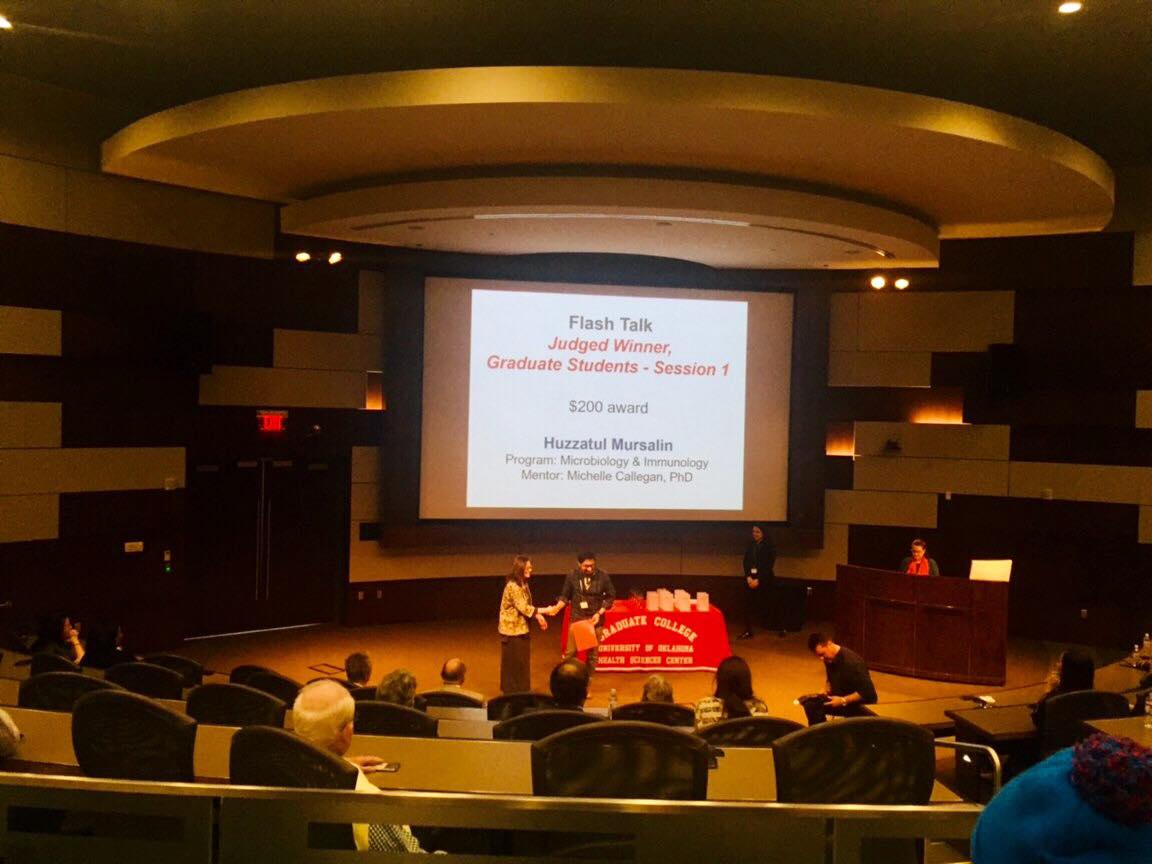 Mursalin was the Flash Talk Session 1 Winner at the OUHSC GREAT Symposium for his flash talk presentation of Contribution of S-Layer to the Pathogenesis of Bacillus Endophthalmitis. Congratulations Mursalin!!!