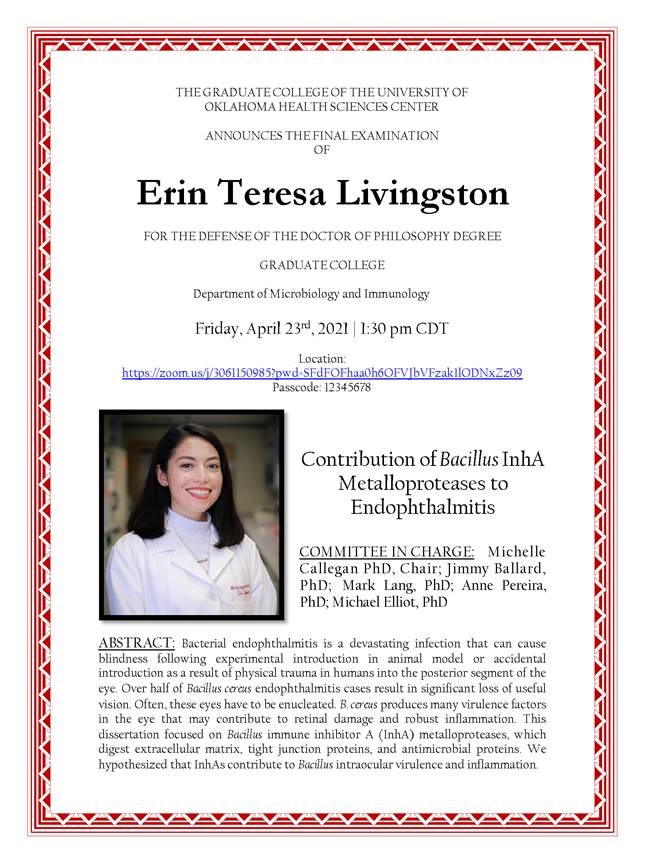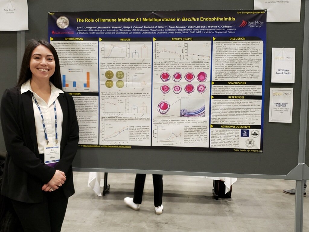 The most exciting happening — In April, Erin defended her dissertation titled Contribution of Bacillus InhA Metalloproteases to Endophthalmitis, and earned her Ph.D. in the Department of Microbiology and Immunology. Congratulations to Dr. Livingston! Erin accepted a position as Lead Scientist at EyeCRO in Oklahoma City and we wish her all the best!