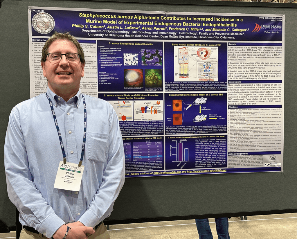 Dr. Coburn published his work on CXC chemokines in staphylococcal endophthalmitis in March: Coburn PS, Parrott AC, Miller FC, LaGrow AL, Mursalin MH, Callegan MC. The role of C-X-C chemokine in Staphylococcus aureus endophthalmitis. Invest Ophthalmol Vis Sci. 2023 Mar 1;64(3):10. doi: 10.1167/iovs.64.3.10. PMID: 36867134 PMCID: PMC9988700