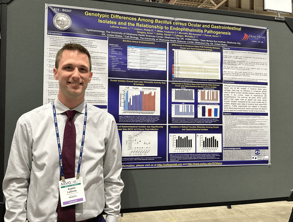 Dr. Coburn’s work on Bacillus virulence genotypes was published in December: Coburn PS, Miller FC, LaGrow AL, Mursallin MH, Gregory A, Parrott A, Astley D, Callegan MC. Virulence-related genotypic differences among Bacillus cereus ocular and gastrointestinal isolates and the relationship to endophthalmitis pathogenesis. Front Cell Infect Microbiol. 2023 Dec 1;13:1304677. PMIC:38106476 PMCID:PMC10722173.